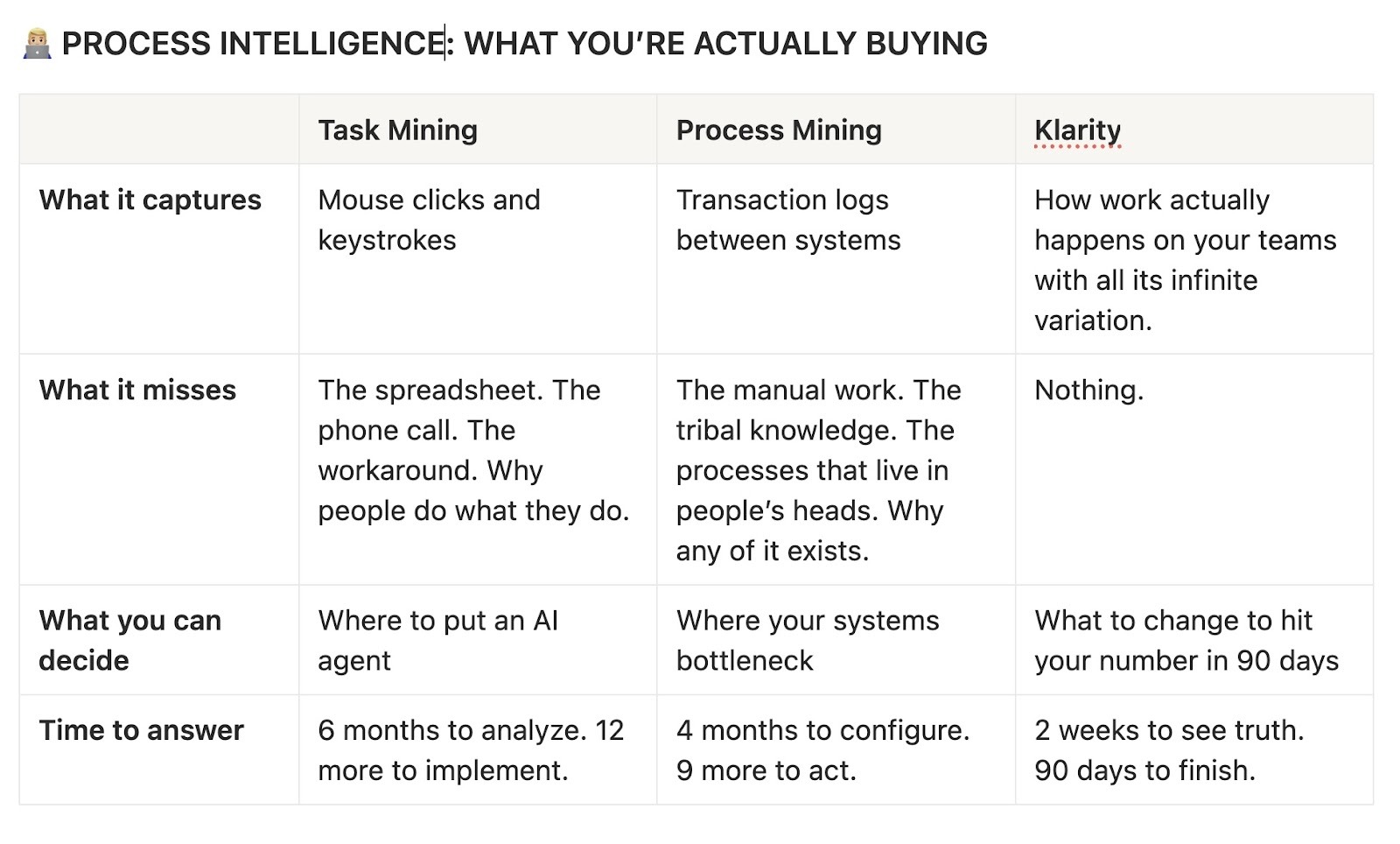 We often get asked if there’s a difference between Klarity and any other process intelligence or task mining tools from Celonis, Microsoft, or SAP Signavio. Here’s a quick breakdown.